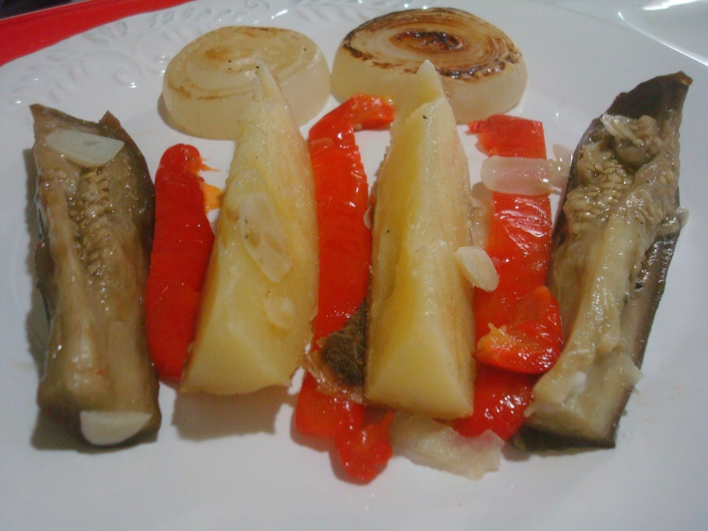 Ensalada de vegetales cocidos al alumnio, berenjena, morron, cebollin, papa,